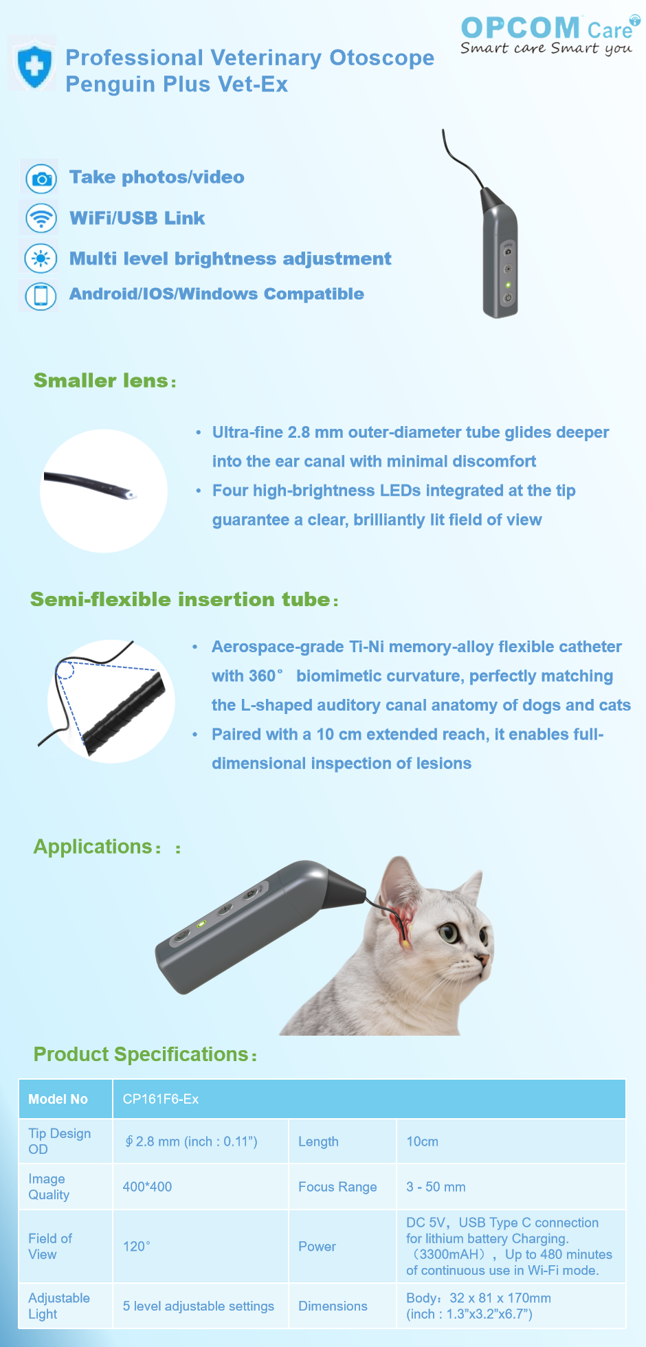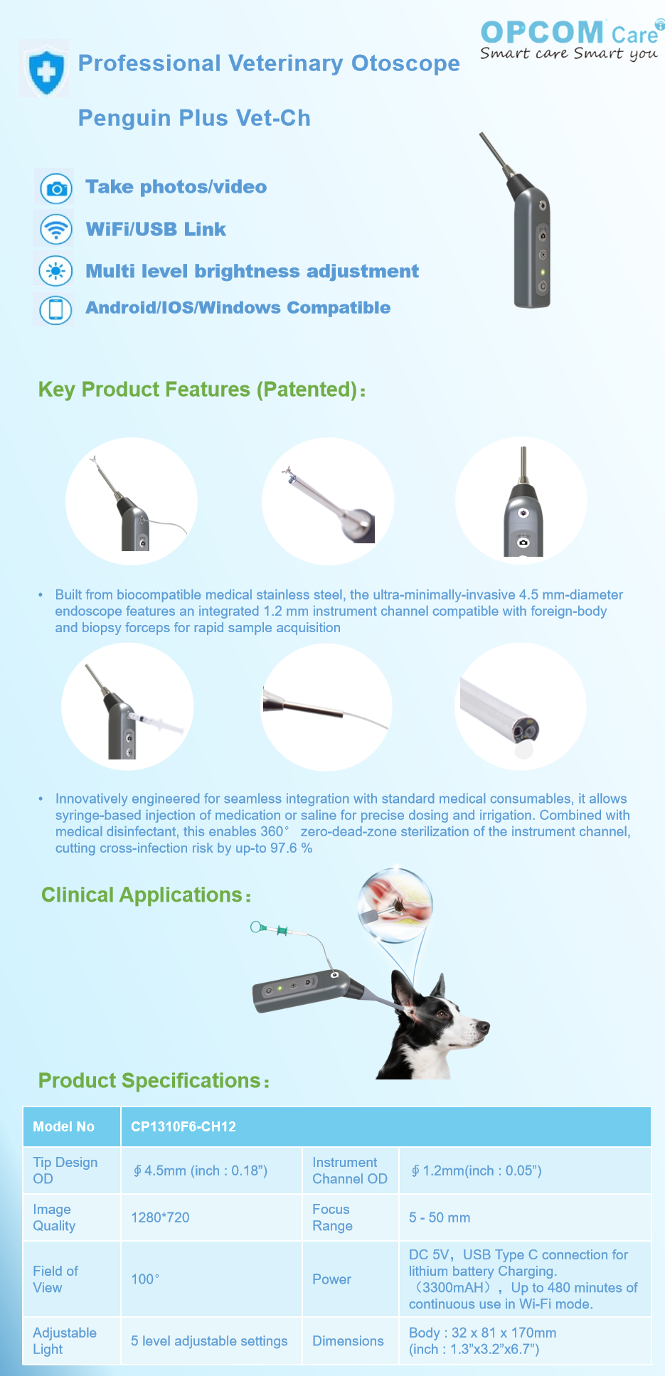 At this exhibition, OPCOM Will showcase Care New products in the series, including Penguin Series new Products Penguin Plus Vet - Ch, Penguin Plus Vet - Ex,Duck Plus。 These products have unique product features that enable high-definition observation and treatment of pet ear canal patients.